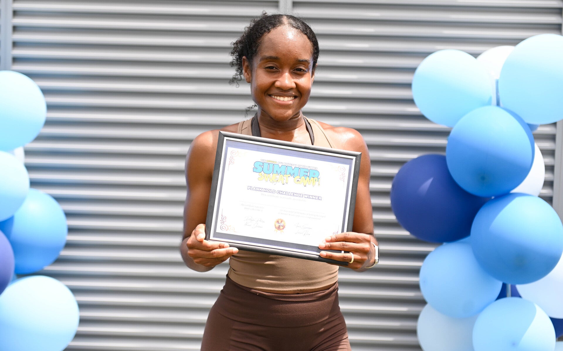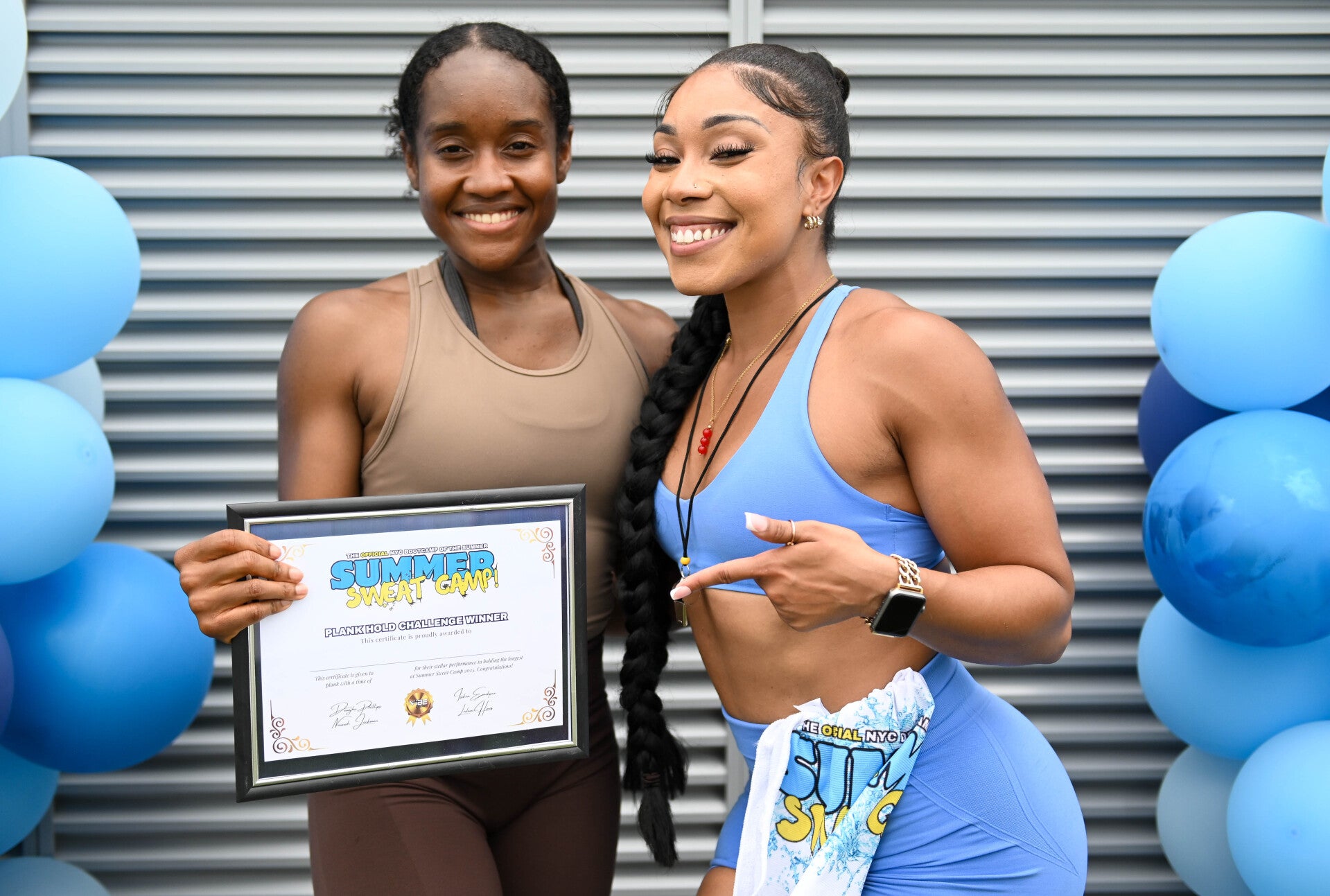 Of the five participants who competed in the Plank competition, Kadijah Ducille was the last one standing with a plank time of around 4:53 sec. Kadijah, who is Trinidadian works out around 4 - 5 days a week and this was her first time participating at a Summer Sweat Camp. She stated: "My fitness goals currently are to build more muscle and to improve my athletic performance. I balance my fitness goals with my busy lifestyle by making time for fitness and my well-being nonnegotiable. I schedule my workouts early in the mornings before my day begins to ensure that I make time to remain active and I also prioritize eating whole foods that support my fitness goals and overall health. Prioritizing my fitness and nutrition in this way allows me to show up better for myself and in my job as an attorney. I had an incredible experience at Summer Sweat Camp. It was a great opportunity for me to meet and build community with other like minded people who enjoy being active and work in the fitness industry. I found out about Summer Sweat Camp through my coach and mentor Denajha Phillips, who is also the founder of Summer Sweat Camp."